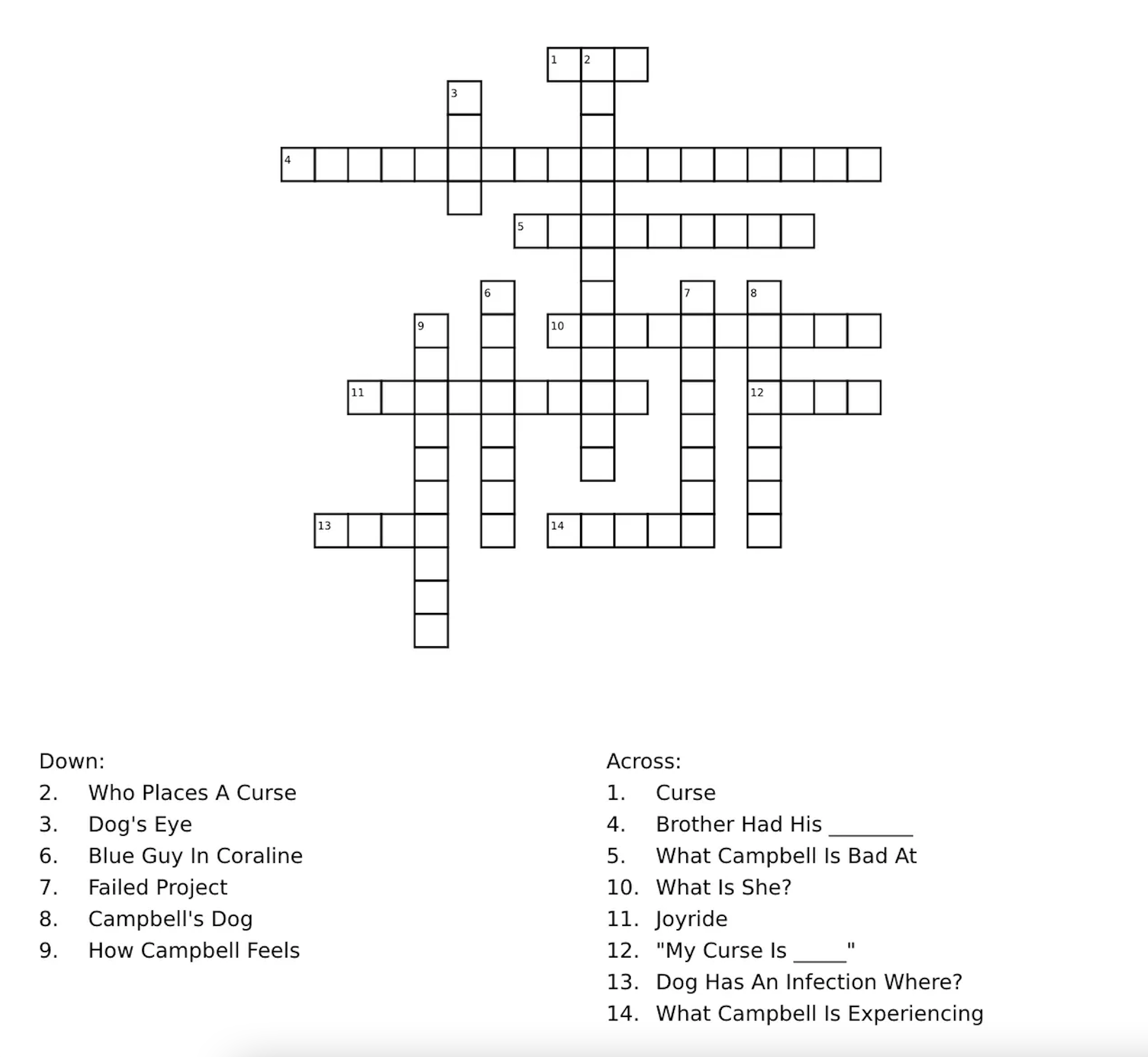Daisy also gave me the grand idea to make games for everyone who reads this to play, so to test this idea out, I made a crossword. You probably are going to have to print it out to play, and you won't know if you are correct, but if anything, I think it makes it all the more exciting. Here it is: